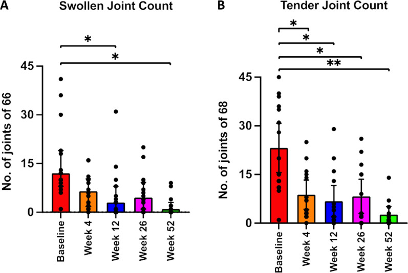 腫脹和壓痛關(guān)節評分(根據ACR66/68關(guān)節評估測量)在隨訪(fǎng)結束時(shí)顯示與基線(xiàn)相比在第52周有顯著(zhù)改善,中位數從12.0 (IQR 8.0–19.0) 下降到1 (IQR 0.0) –3.0) 用于腫脹關(guān)節,20.0 (IQR11.0–36.0) 至1.0 (IQR0.0–4.0) 用于觸痛關(guān)節計數。療效數據分析表明,關(guān)節計數的改善具有統計學(xué)意義(p=0.003和p=0.0008),并且分別對腫脹和壓痛關(guān)節計數具有較大的影響(ES = 0.83 和 ES = 0.93);圖2, 表2)。