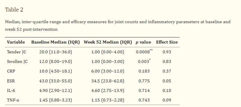表2:基線(xiàn)和干預后第52周的關(guān)節計數和炎癥參數的中位數、四分位間距和療效測量。