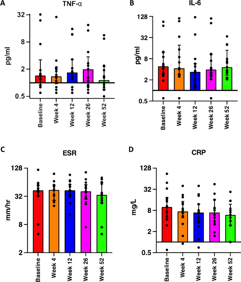 圖3:炎癥參數。與基線(xiàn)相比,后續訪(fǎng)問(wèn)中炎癥細胞因子、TNF-α或IL-6的水平未顯示任何顯著(zhù)變化 (a , b)。