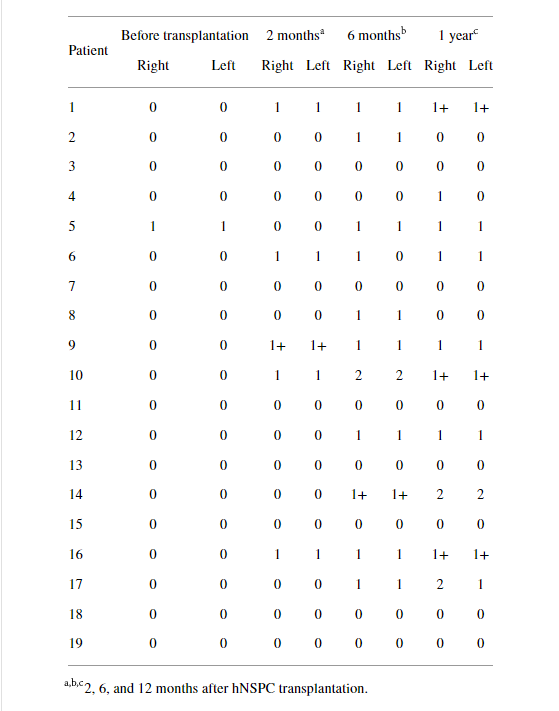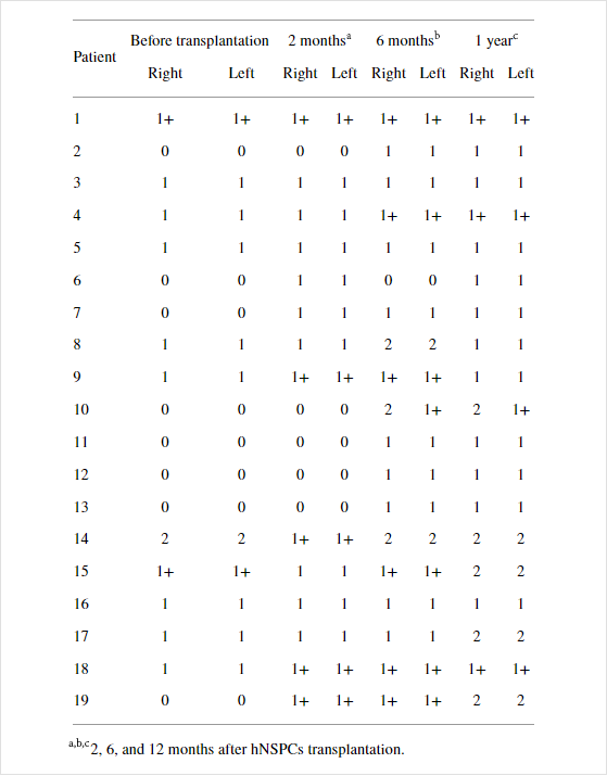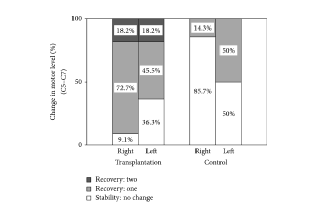 沒(méi)有死亡率。在神經(jīng)干/祖細胞植入后,沒(méi)有患者出現感染、腦脊液滲漏、嚴重危及生命的自主神經(jīng)反射異?;蜻M(jìn)行性脊柱畸形。由于直接將細胞注射到受傷的脊髓中,術(shù)后感覺(jué)和運動(dòng)功能、膀胱并發(fā)癥或神經(jīng)水平?jīng)]有惡化。沒(méi)有患者表現出呼吸功能惡化,所有參與者似乎都應對得很好。