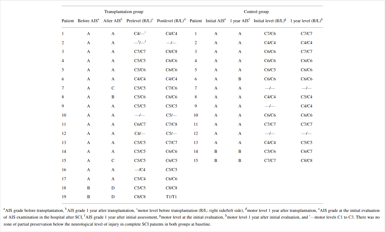 因此,與對照組相比,移植組中AIS-A患者在1年時(shí)恢復了一個(gè)或多個(gè)運動(dòng)水平的比例更高。在基線(xiàn)時(shí),兩組完全SCI患者的神經(jīng)損傷水平以下沒(méi)有部分保留區域。