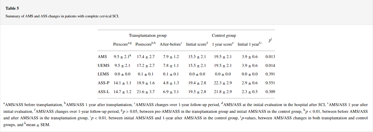 然而,分別轉換為AIS-C和AIS-B的患者7和8在移植后1年分別顯示LEMS增加2分和ASS-L增加54分(表7和9)。在不完全性SCI中,與對照組相比,移植組中的兩名患者在1年時(shí)表現出更大的LEMS和ASS-P增加(表6–9)。