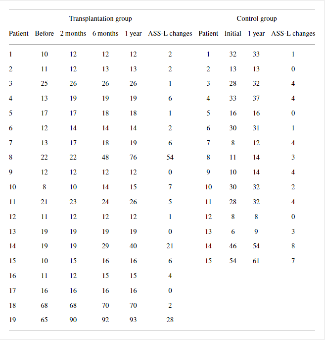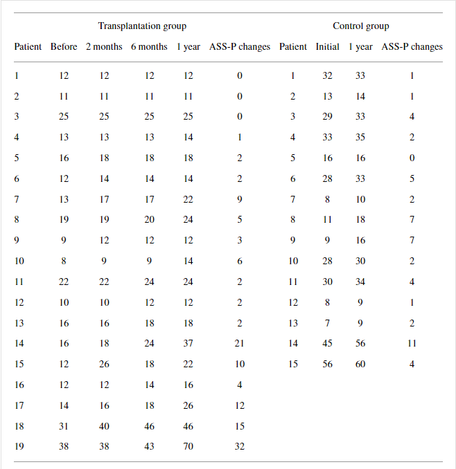 然而,移植組UEMS超過(guò) 1 年的平均變化顯著(zhù)大于對照組(對比; ),而ASS-P和ASS-L超過(guò)1年的平均變化在兩組中沒(méi)有顯著(zhù)差異(表5)。在移植組的AIS-A患者中,AIS分級轉換與AMS和ASS超過(guò)1年的變化之間沒(méi)有明顯的相關(guān)性。