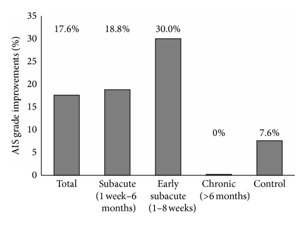 方法:研究人員選擇了 19 名患者進(jìn)行神經(jīng)干/祖細胞移植。根據損傷發(fā)作與神經(jīng)干/祖細胞移植之間的時(shí)間窗,符合條件的患者分為四組:急性(<1 周)和、早期亞急性(1-8 周)、晚期亞急性(9 周-6 個(gè)月)和慢性(>6 個(gè)月)。對照組15例外傷性頸椎SCI患者均行椎管減壓手術(shù)后轉診至醫院康復門(mén)診。他們沒(méi)有接受脊髓損傷的神經(jīng)干/祖細胞植入。