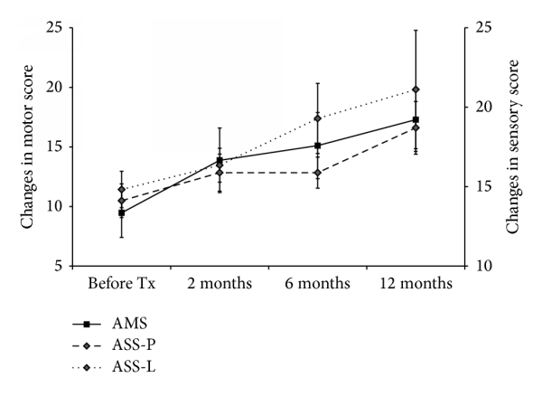 表6-9和圖3總結了移植組和對照組在基線(xiàn)和1年隨訪(fǎng)期間使用ASIA評分獲得的數據變化。在A(yíng)IS-A患者中,基線(xiàn)時(shí)各組之間的任何神經(jīng)學(xué)指標(AMS、UEMS、LEMS、ASS-P 或 ASS-L)均無(wú)統計學(xué)顯著(zhù)差異。兩組 AIS-A患者的AMS、UEMS、ASS-P和 ASS-L,但不是LEMS,從基線(xiàn)到1年顯著(zhù)增加(表5)。這些結果表明,神經(jīng)系統檢查顯示兩組完全SCI患者的運動(dòng)和感覺(jué)評分隨時(shí)間輕微但顯著(zhù)增加。