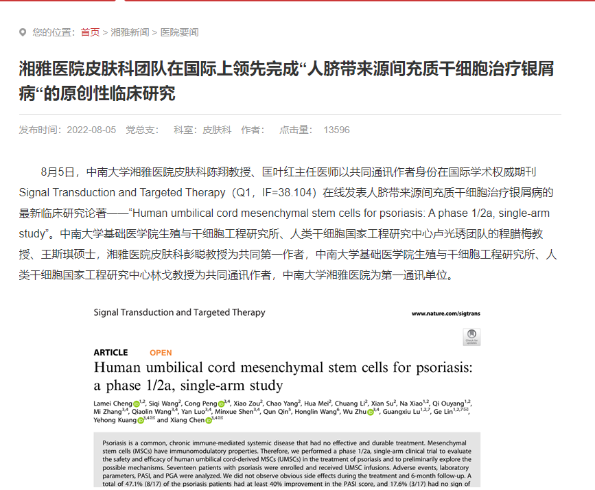2022年8月5日,中南大學(xué)湘雅醫院在Nature子刊《signal transduction and targeted therapy》發(fā)表間充質(zhì)干細胞治療銀屑病最新臨床研究結果。