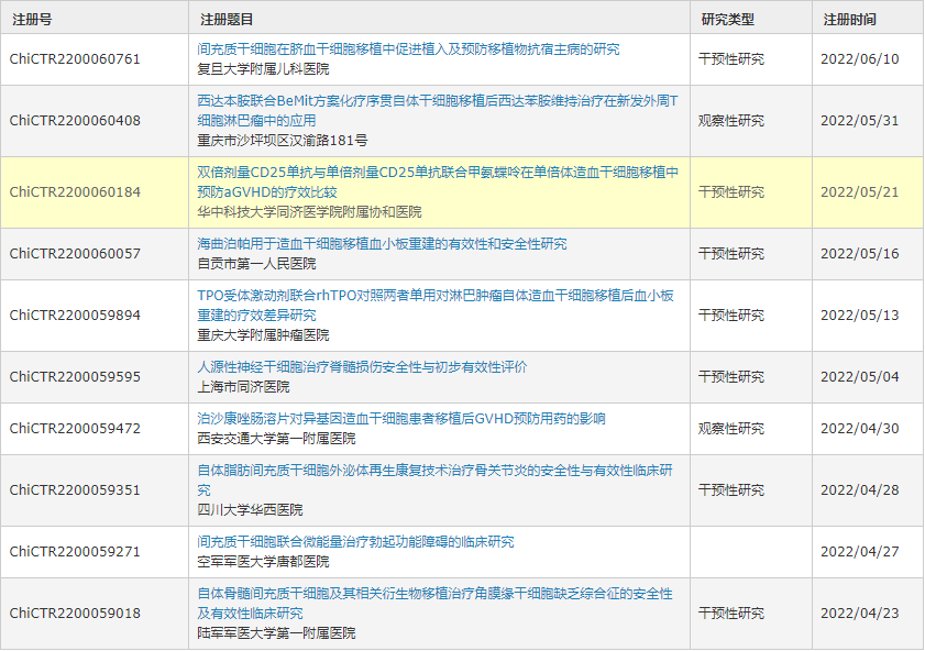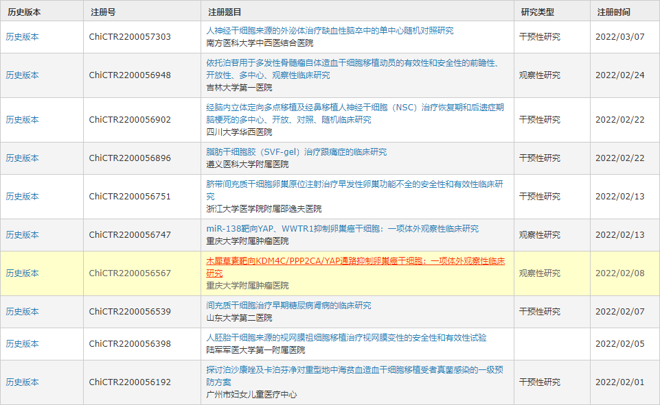 以下是2022年中國干細胞臨床試驗注冊中心,2022年注冊的臨床項目。