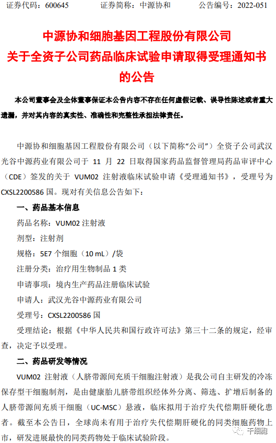 中源協(xié)和細胞基因工程股份有限公司(以下簡(jiǎn)稱(chēng)“公司”)全資子公司武漢光谷中源藥業(yè)有限公司于11月22日取得國家藥品監督管理局藥品審評中心(CDE)簽發(fā)的關(guān)于VUM02注射液臨床試驗申請《受理通知書(shū)》,受理號為CXSL2200586 國?,F對有關(guān)信息公告如下: