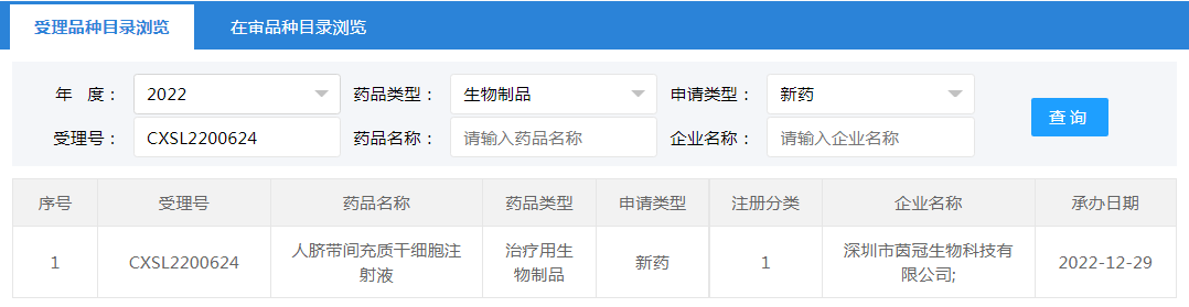 2022年12月29日,深圳市茵冠生物科技有限公司“人臍帶間充質(zhì)干細胞注射液”的藥物臨床試驗申請獲受理(受理號:CXSL2200624)。這是深圳市茵冠生物第一款獲得受理的干細胞注射。